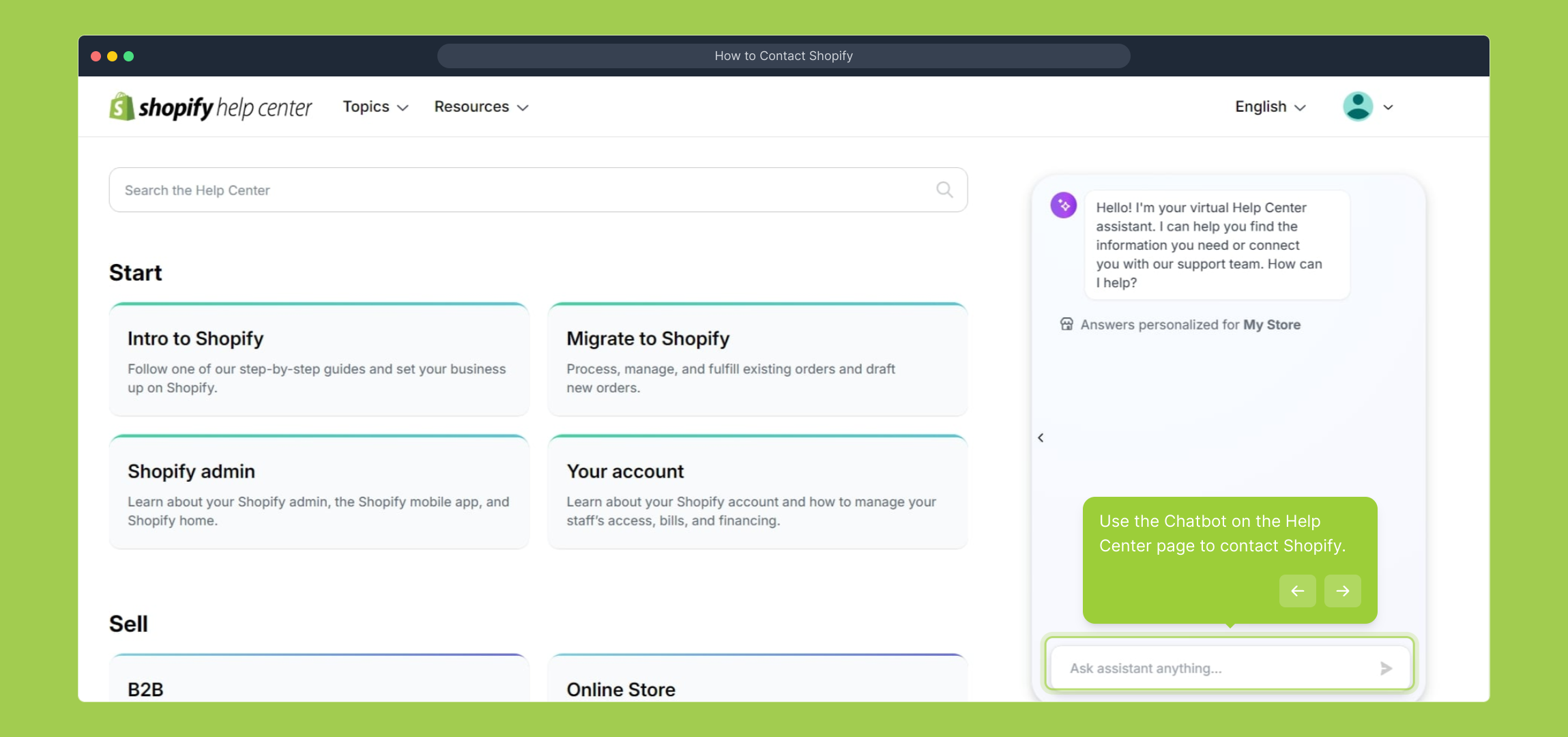 On the Help Center page, you’ll find a handy Chatbot ready to assist. Use this feature to reach out directly to Shopify support and get real-time help or answers to your queries.