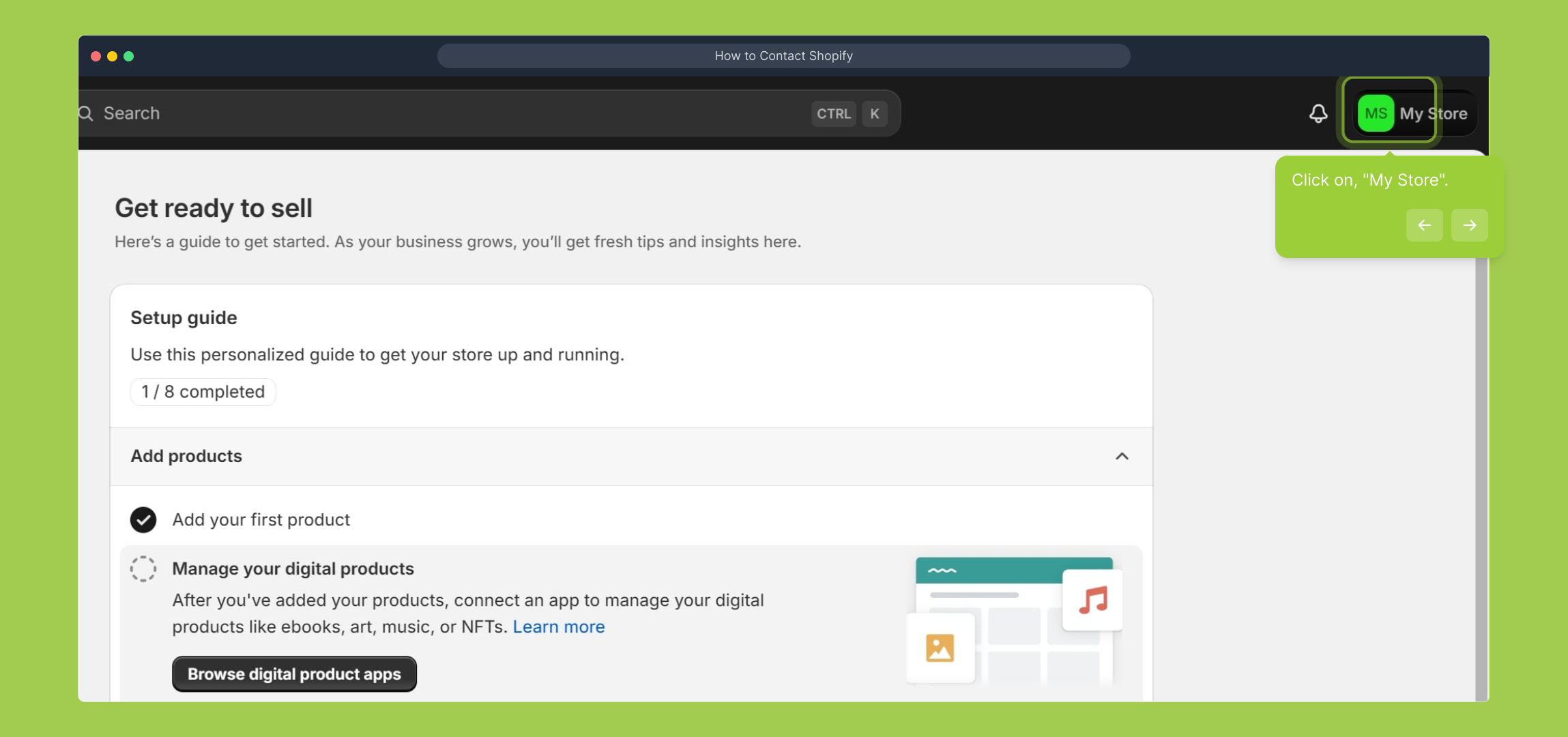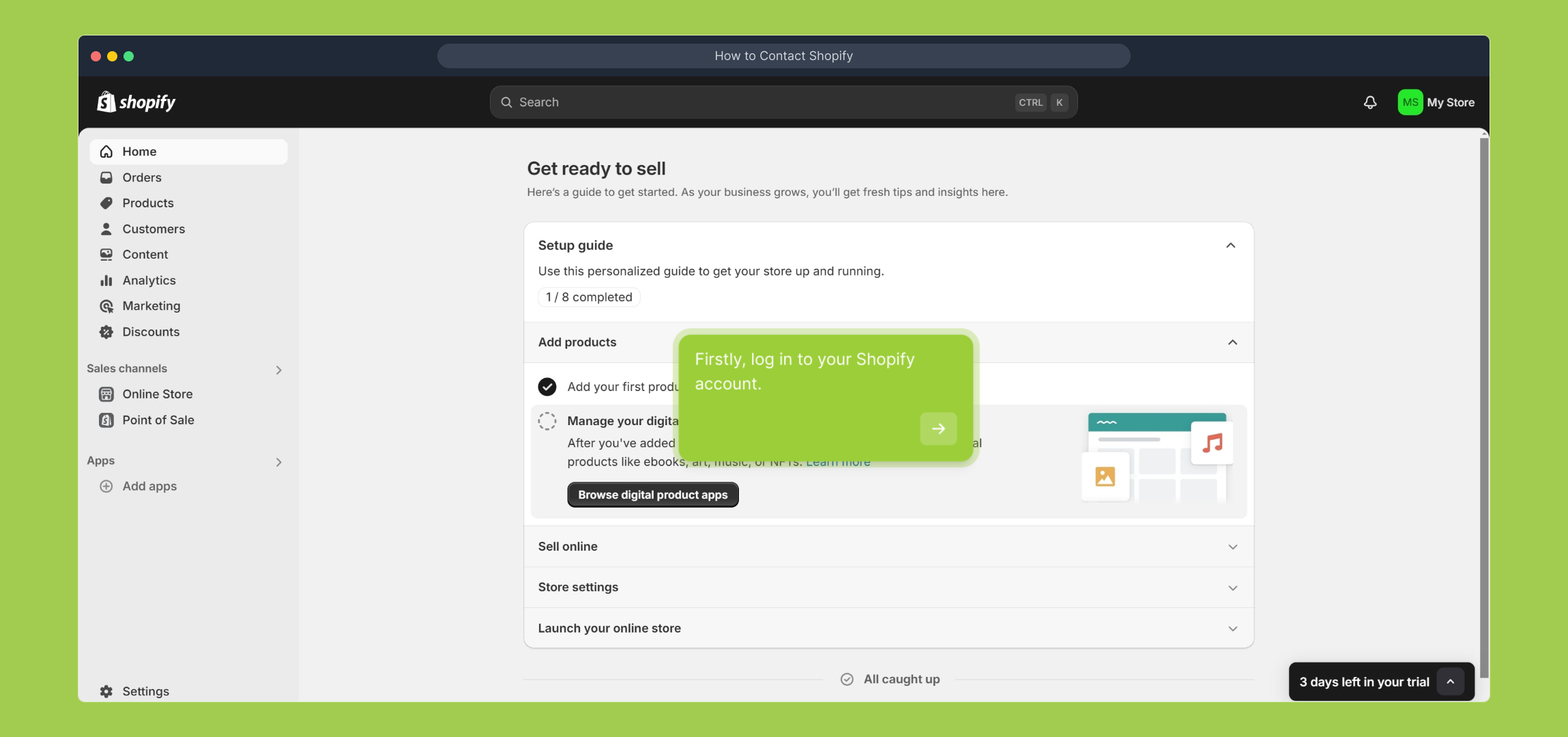 After logging into your Shopify account, click on “My Store” and select the “Help Center” link. This central resource has guides, FAQs, and live support options.