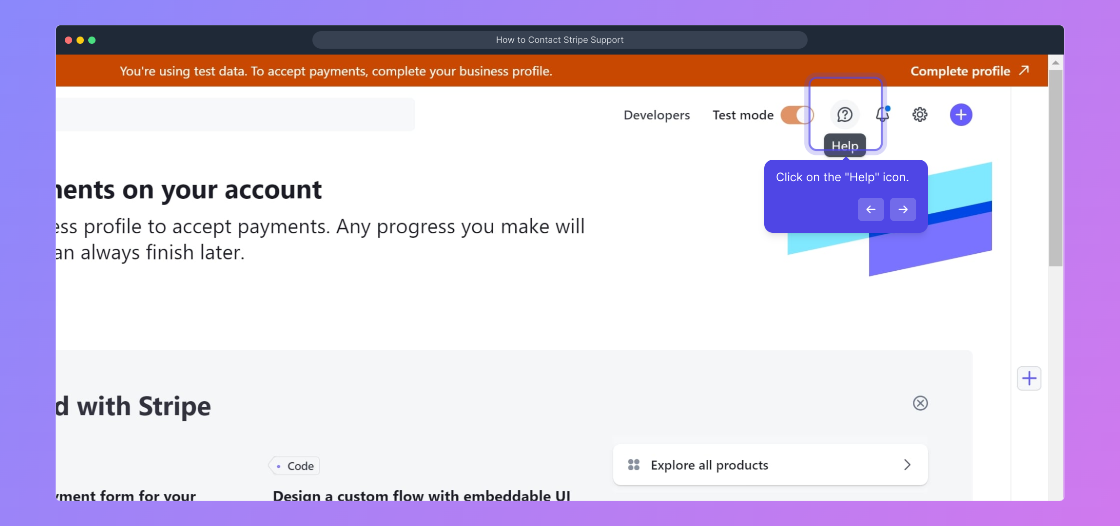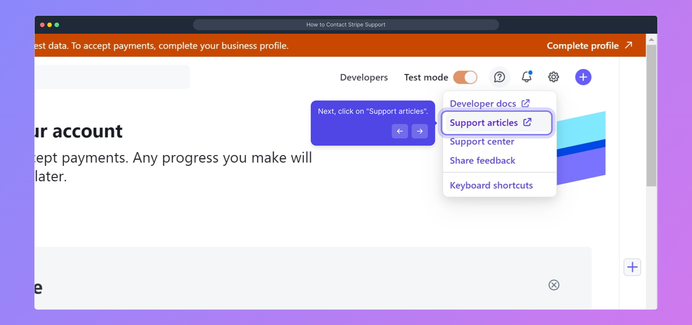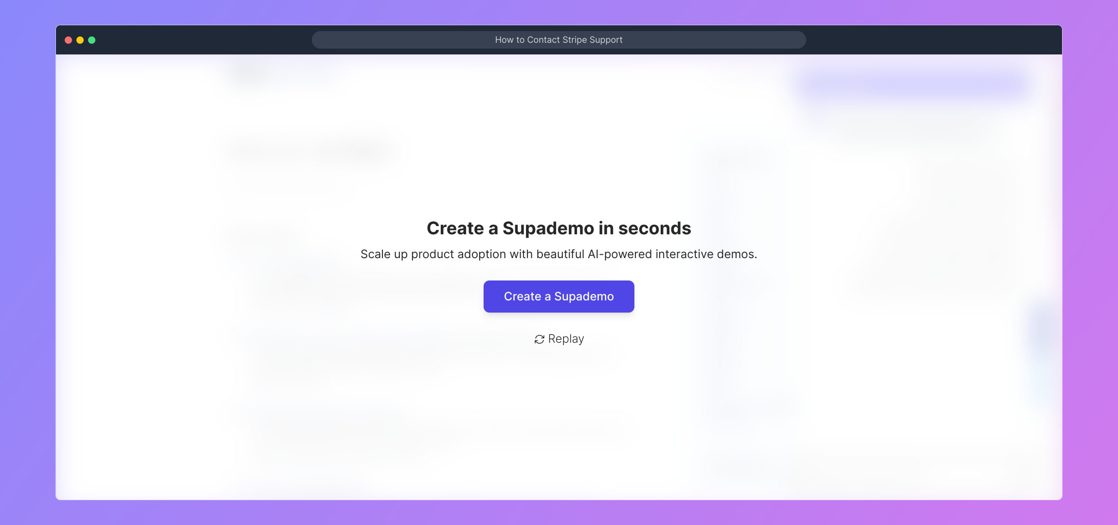 This interactive demo/guided walkthrough on How to Contact Stripe Support was created using Supademo.