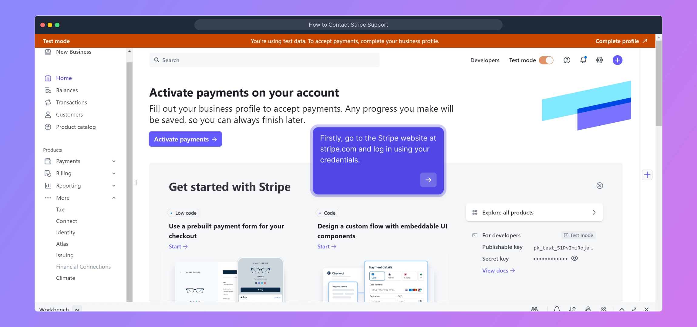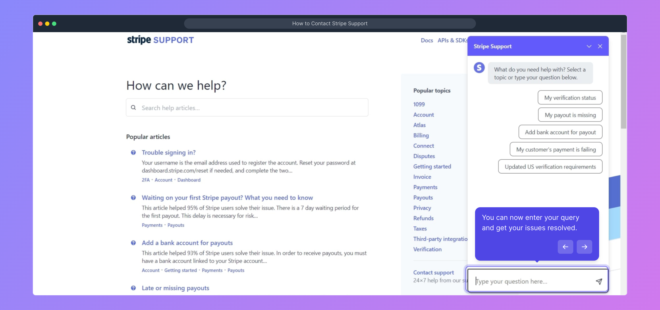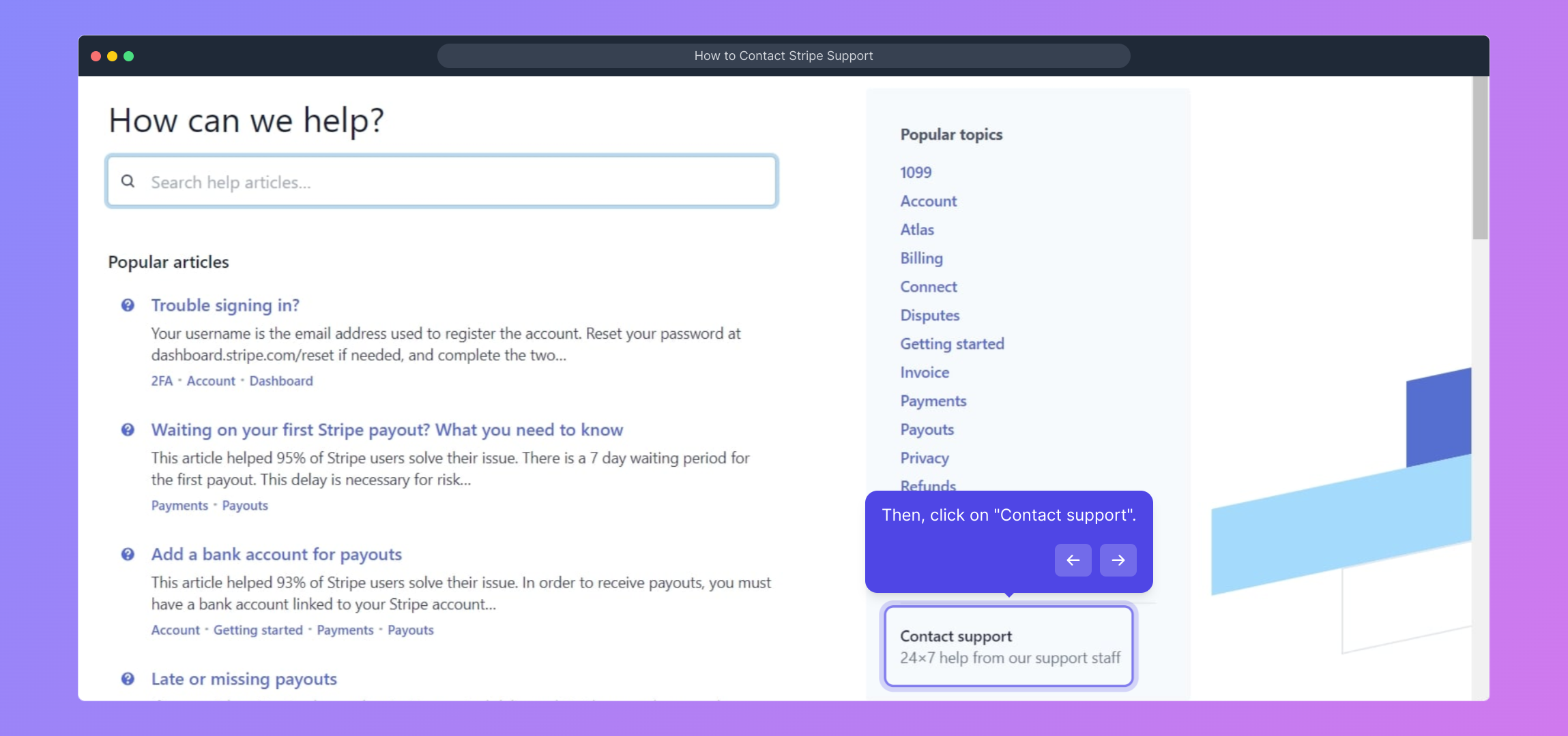 If you don’t find the answer you’re looking for, click on "Contact support" to reach out directly to Stripe’s customer service team for personalized assistance.