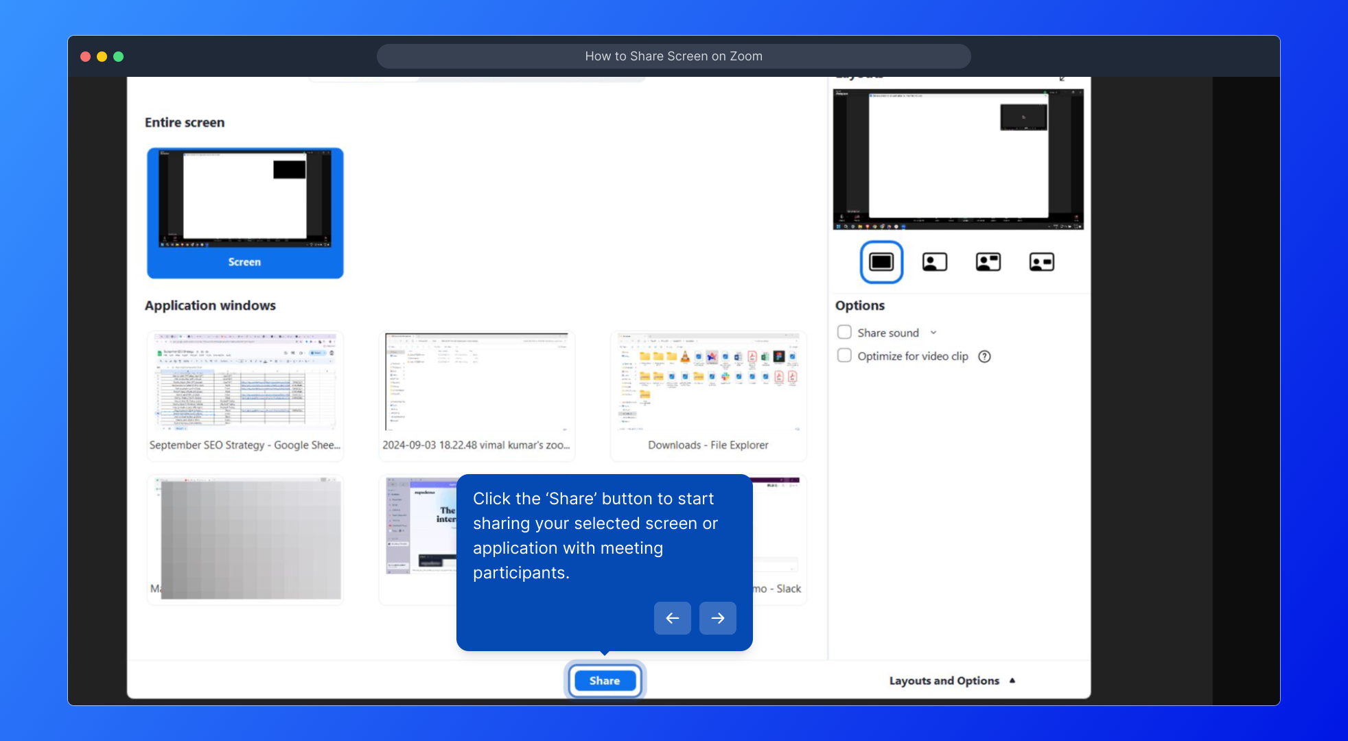 After clicking ‘Share Screen,’ a new window will appear displaying thumbnails of all available screens and applications on your device. This lets you choose exactly what you want to share.