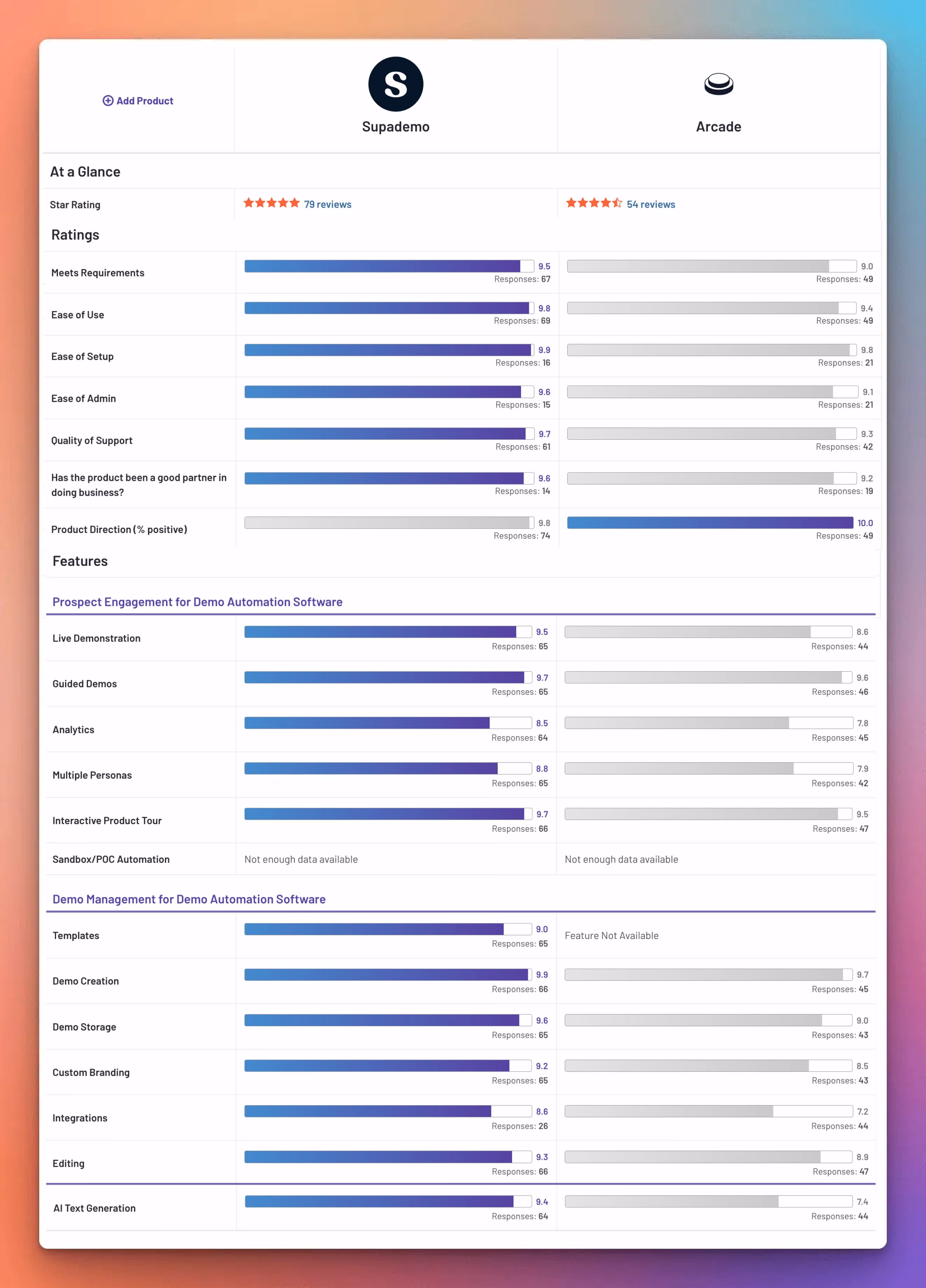 While Arcade Software is a powerful demo automation tool, users find Supademo easier to use, better suited for team collaboration, and more feature-packed across more affordable plans. See the full G2 breakdown of why Supademo is an excellent Arcade Software alternative.