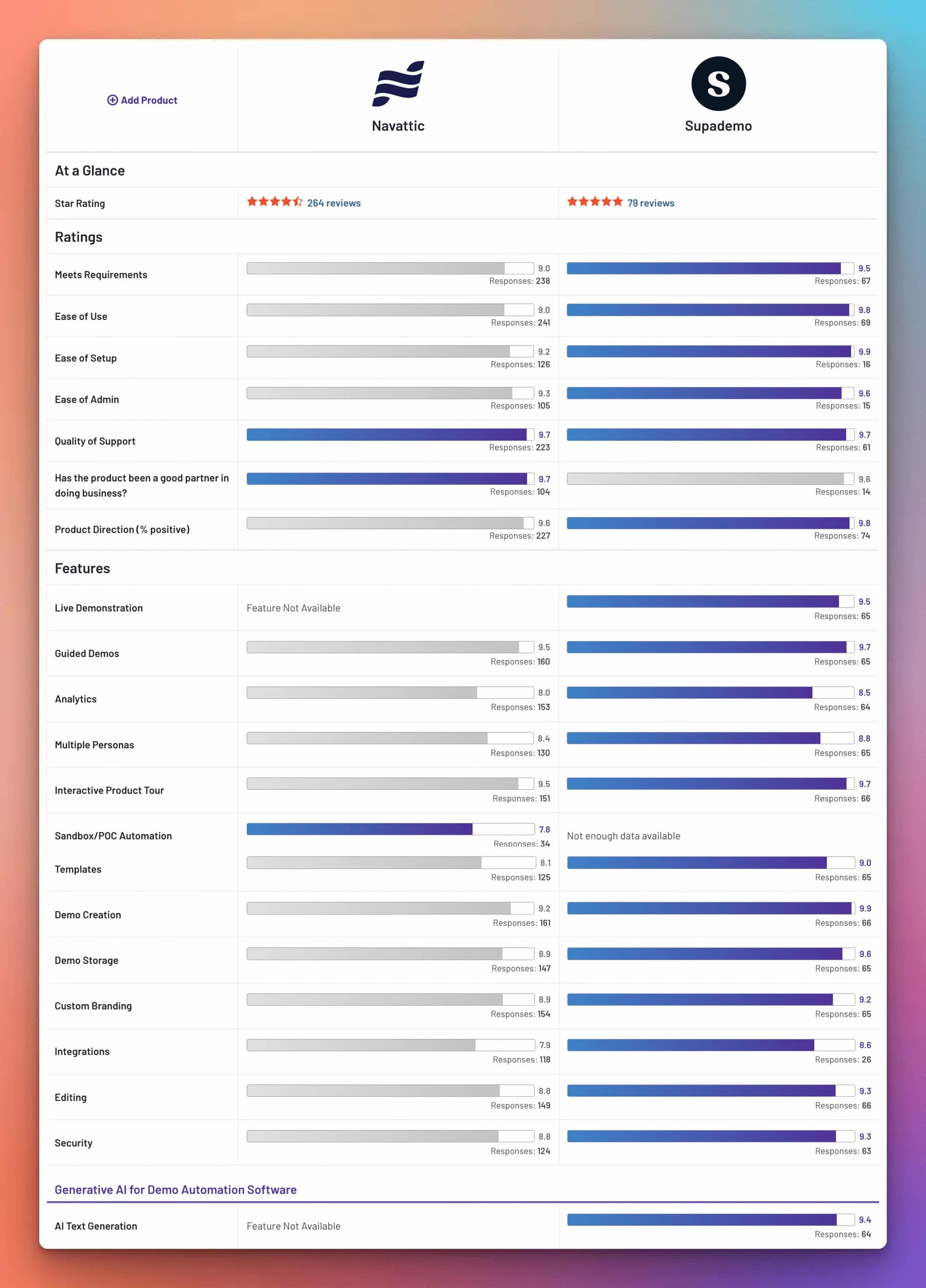 Supademo Best for Customer Success, Sales, Onboarding | Navattic Best for Sales | |